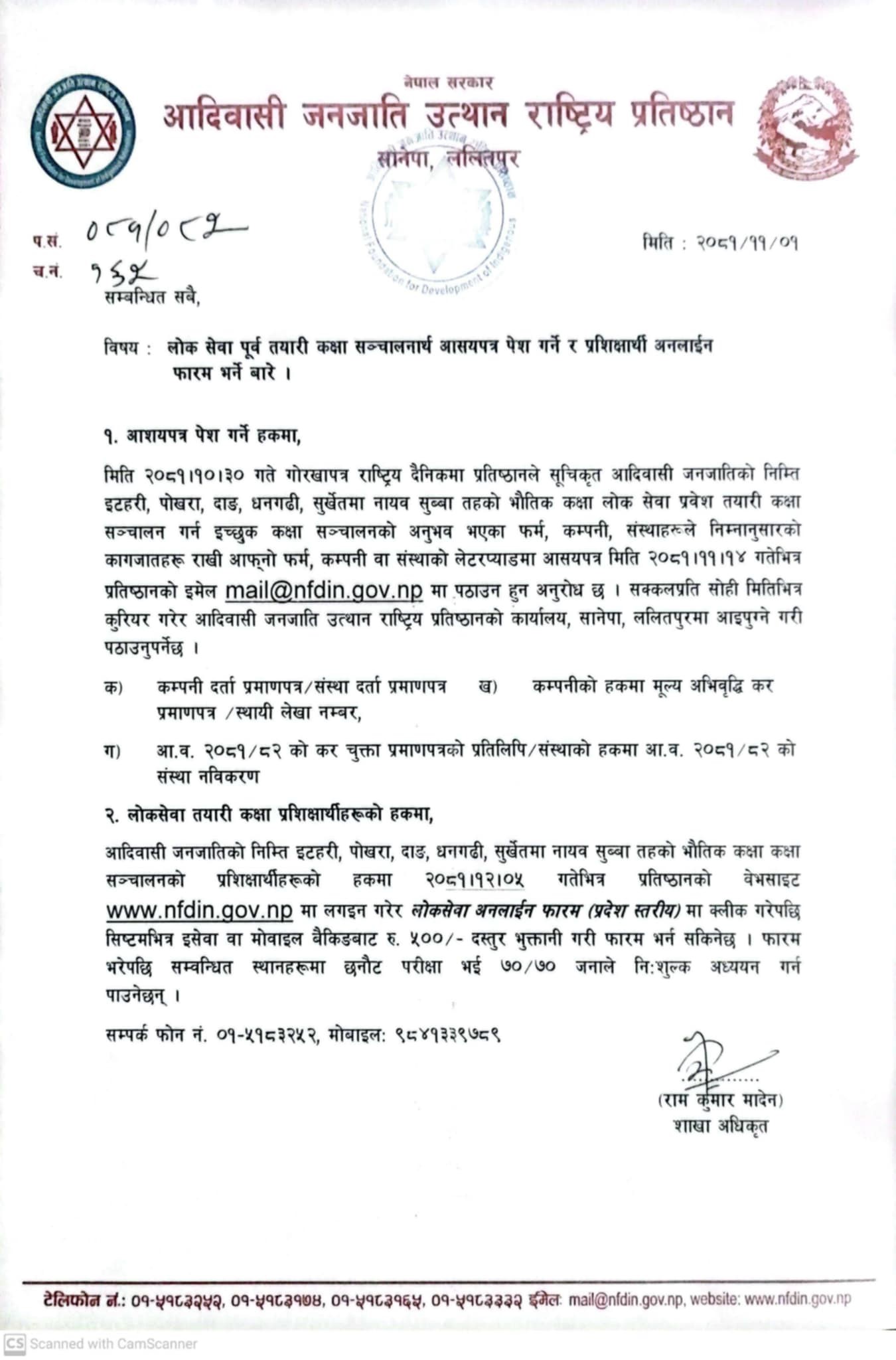 लोकसेवा तयारी कक्षाको लागि आशय पत्र र प्रशिक्षार्थी अनलाईन आवेदन बारे ।